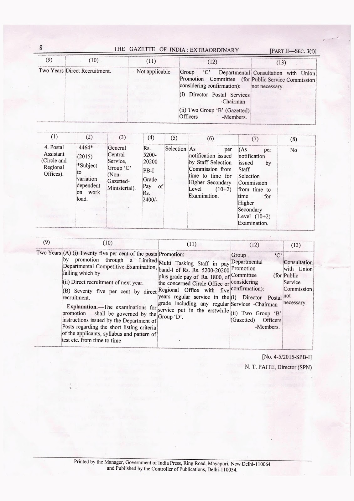 Postal Assistant/Sorting Assistant PB -1(Rs. 5200-20200) Grade Pay 2400